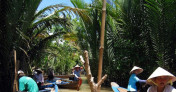 After breakfast, we take a cycling walking through the traditional villages with many ancient traditional houses, set amongst a peaceful atmosphere and fruit trees, bonsai garden and witness the unusual yet fascinating process of coconut candy, the bang conical hat and rice paper in the making.